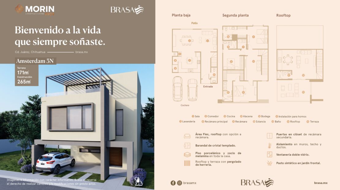 El Modelo Ámsterdam es el modelo más ambicioso y codiciado de Brasa Desarrollos. La principal característica cautivadora son sus tres niveles de altura, convirtiéndolo en el modelo más grande de los desarrollos de Brasa. Gracias a eso, le añade una gran plusvalía como hogar en comparación a las demás casas. Su diseño está hecho para que el tercer nivel sea una estancia de área social con terraza. Además, entre las características del modelo también se pueden encontrar las siguientes: